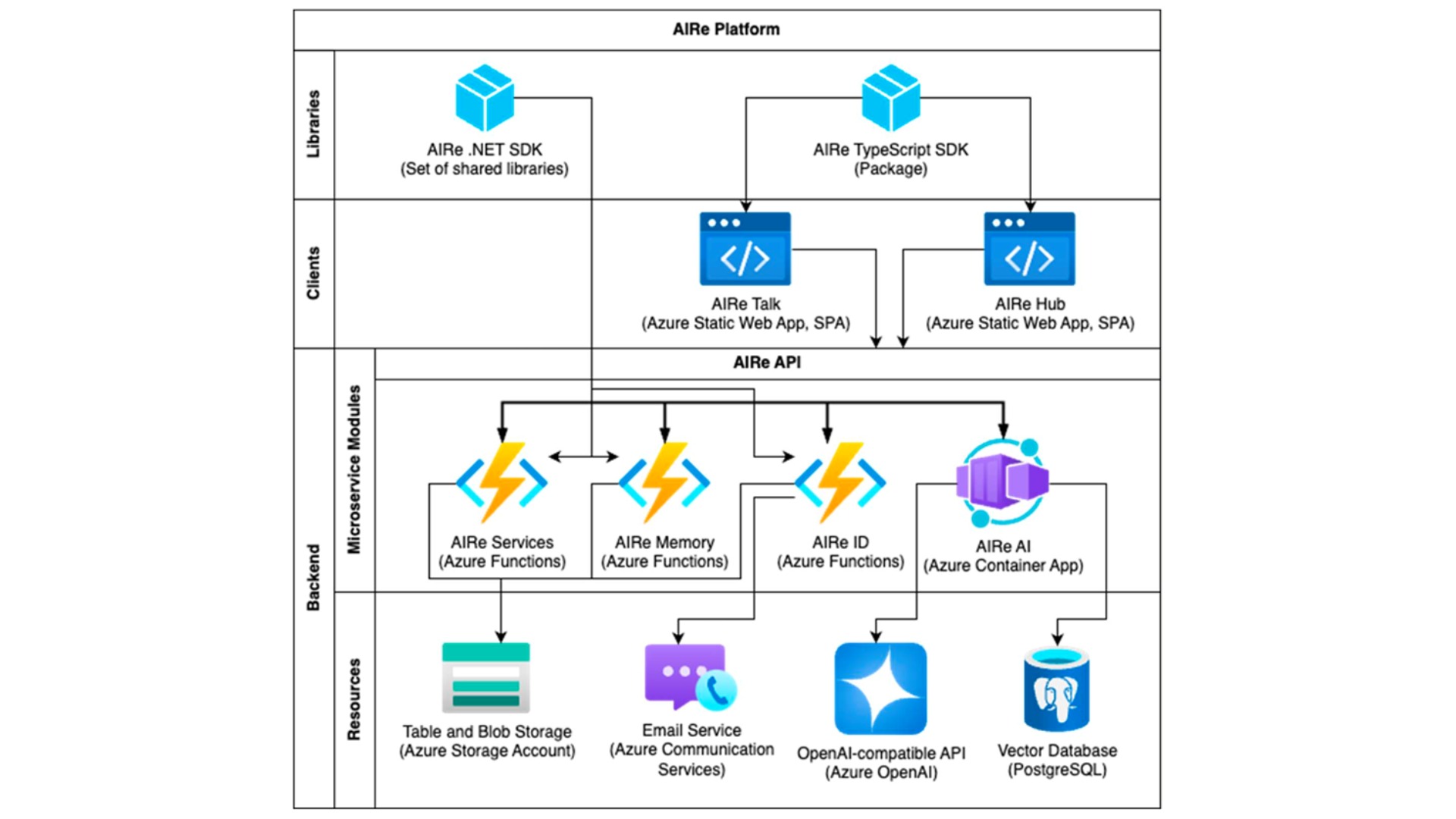 Lisäksi AIRen kehityksessä on hyödynnetty kaupallisia ratkaisuja, jotka voidaan tarvittaessa vaihtaa toiseen alustan modulaarisuuden ansiosta. Esimerkiksi tekoälymoduuli käyttää Microsoftin Azure OpenAI -yhteensopivaa rajapintaa tarjotakseen kehittyneitä tekoälyominaisuuksia, kuten luonnollisen kielen käsittelyä ja muita tekoälypohjaisia toimintoja kuntoutuksen tueksi. AIRe käyttää Microsoftin Azure-pilvipalvelua taustajärjestelmänä.