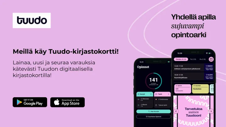 - Tuudo-sovelluksella voit aktivoida kirjastokortin heti käyttöösi, käymättä kirjastossa. Tutustu Tuudo-ohjeeseen.