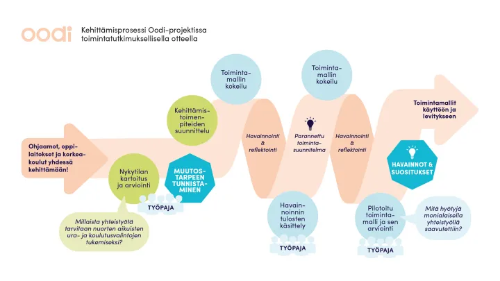 Oodi Ohjaamojen ja oppilaitosten yhteistyölle -projektin (2024-2026) osana toteutetaan toimintatutkimusta. Tutkimuksen tavoitteena on vahvistaa ja laajentaa koulutuksen järjestäjien, oppilaitosten ja korkeakoulujen, sekä Ohjaamojen välistä yhteistyötä. Kehittämisprosessin aikana kerätään aineistoa.